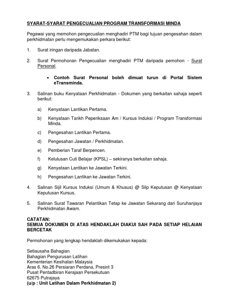 . SYARAT-SYARAT PENGECUALIAN PROGRAM TRANSFORMASI MINDA Pegawai yang memohon pengecualian menghadiri PTM bagi tujuan pengesahan dalam perkhidmatan perlu. Dataset menunjukkan permohonan pengecualian program transformasi minda kpm sektor pendidikan tinggi bagi tahun 2018. Pengecualian menghadiri program transformasi minda boleh dibuat dengan.